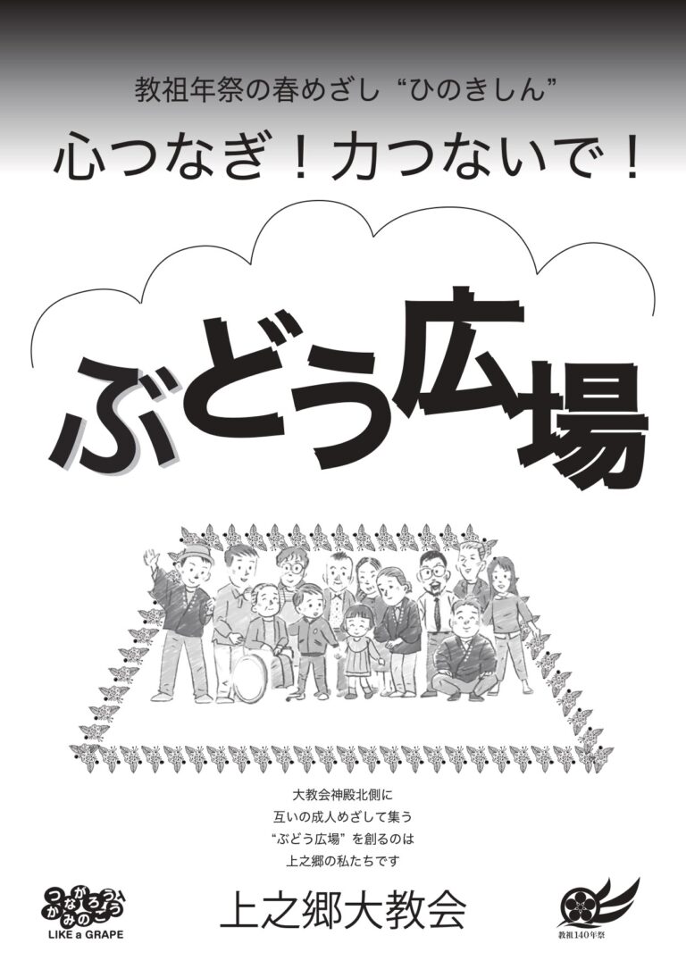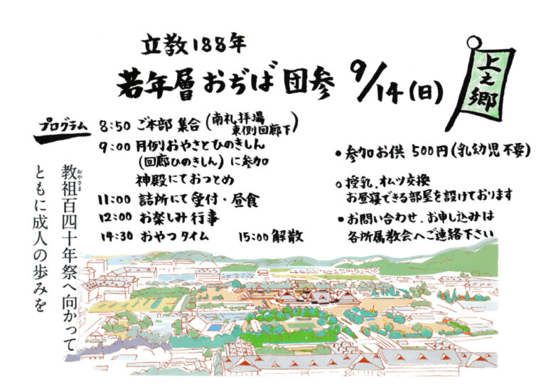 ■大教会からの連絡 2月21日 理明様・容子様お披露目昼食会のご案内 (2024年2月1日) 清々しい晴天の御守護のもと、1月29日(月)、教祖殿にて上之郷大教会の後継者、理明様と容子様の結婚式が行われました。 これに伴い、今月の月次祭祭典終了後に理明様・容子様のお披露目昼食会が大教会1号館地下大広間で行われます。お二人の紹介ビデオ、結婚式の様子などを映像で紹介する予定です。同じ上之郷につながる者 […]